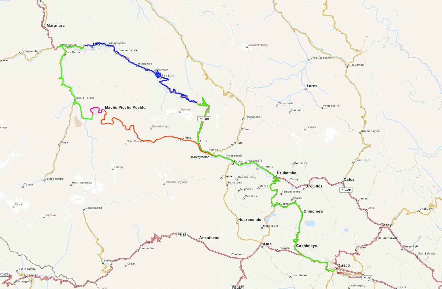 - Day I started with a bus ride to one of the main towns in the Sacred Valley, to Ollantaytambo. From there we headed up the mountains, turning ninety degrees to the right, away from Machu Picchu. "We" refers to a group of eight tourists, plus guide and driver. A lot of switchbacks later we arrived at a pass which crosses the Willkanuta mountain range. From there it was a nice ~65 kilometer mountainbike downhill ride to Santa Maria (the blue track). After a well deserved beer we continued our trip by bus to Santa Teresa, where we reached our first overnight stay. The hot springs in Santa Teresa were the perfect end to a perfect first day.